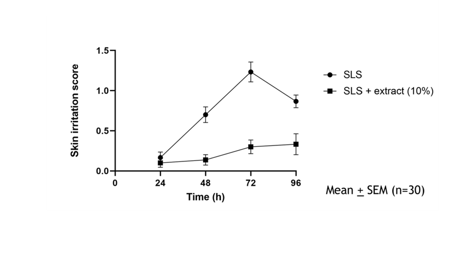 In the graphs below, each round dot represents the average irritation score caused by the positive control experiment (5% SLS) across the 30 individuals. The squares represent our results from investigative application on the skin. Time points are at 24 hours, 48 hours, 72 hours, and 96 hours.