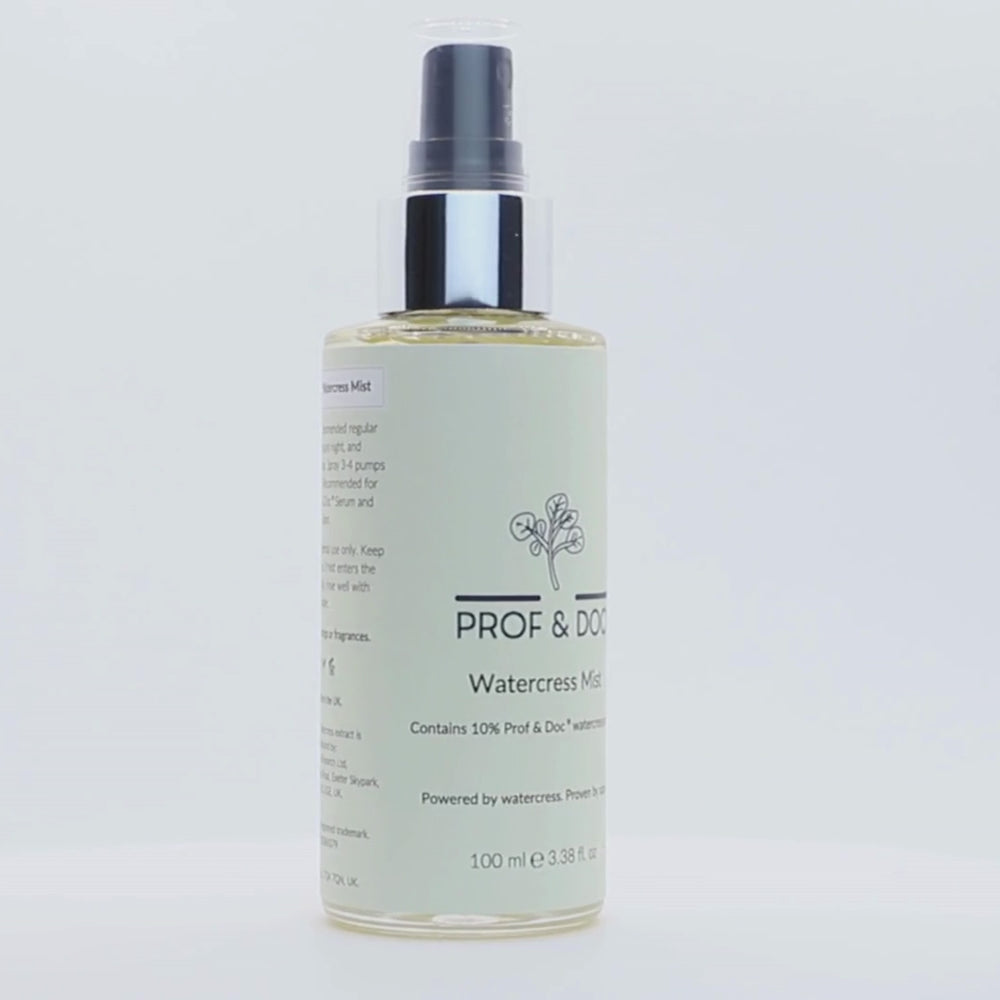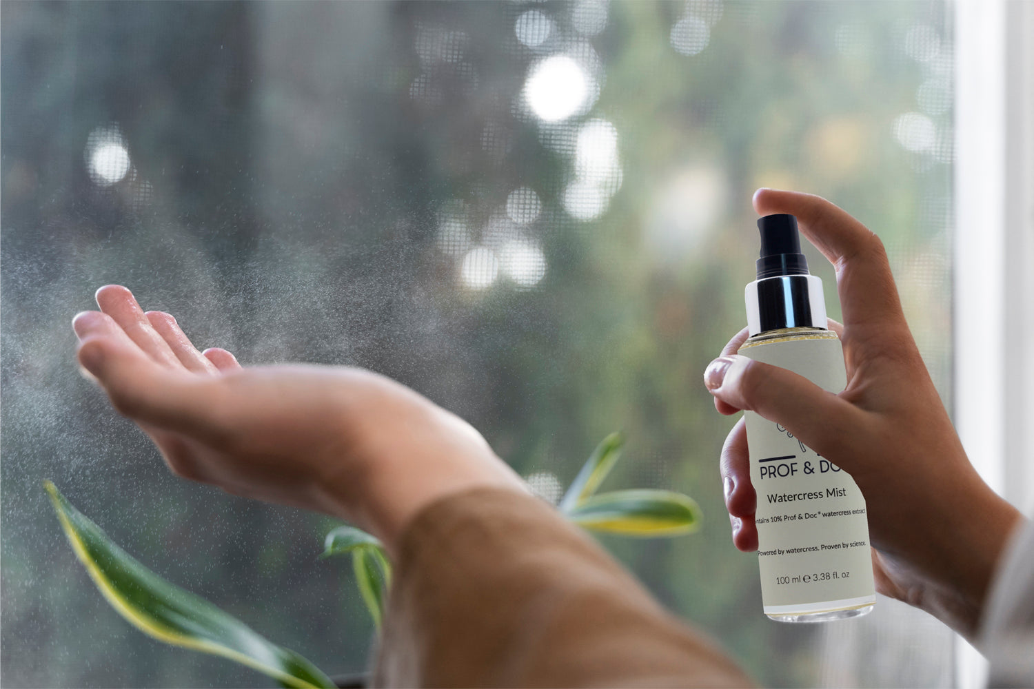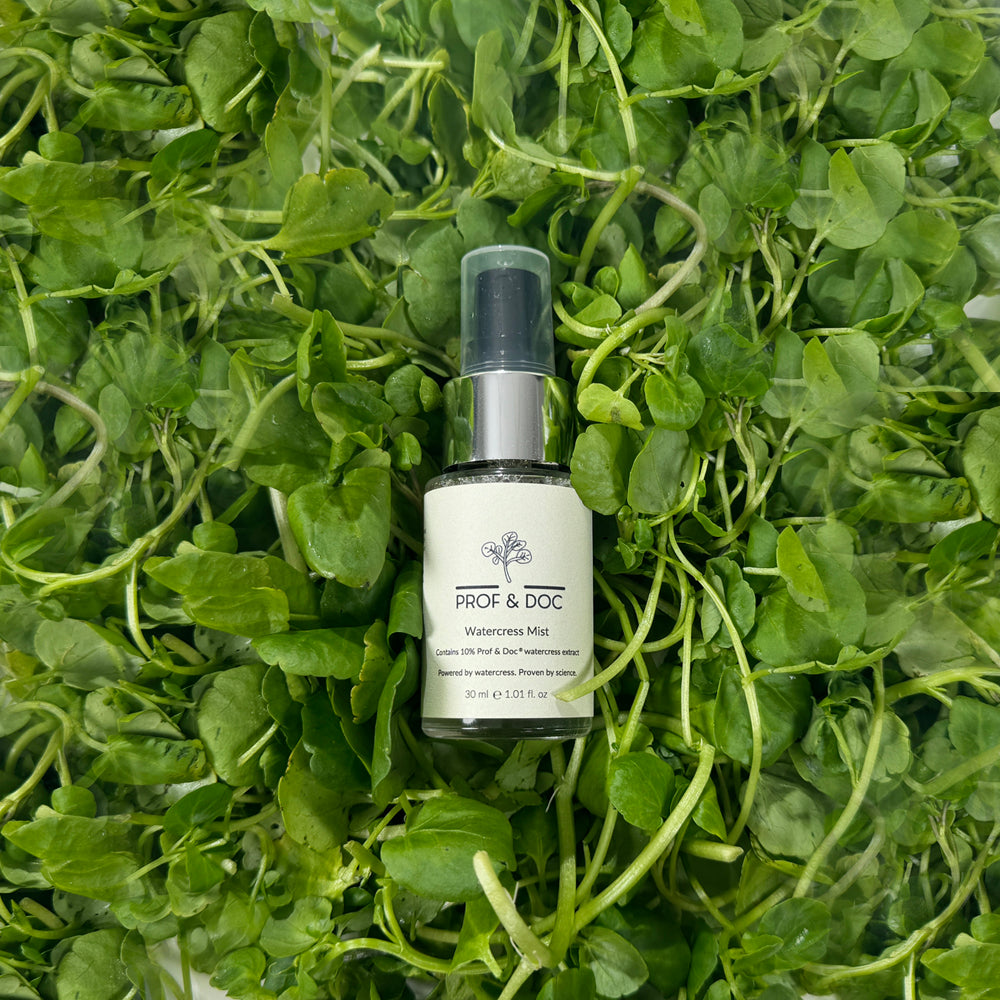 Introducing Prof & Doc ® Watercress Mist, the newest addition to your skincare routine. Our novel Mist, enriched with 10% Prof & Doc's ® watercress extract, has been specially formulated to sooth and help protect your skin against irritation. Its gentle and lightweight formula ensures a cooling experience, with no greasy residue or heavy oils left behind.